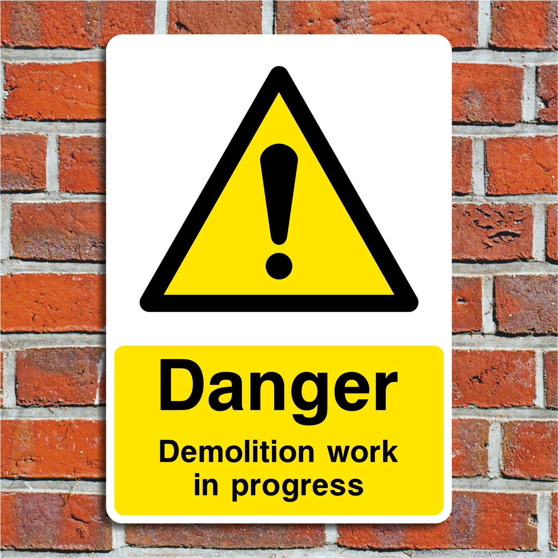 Danger Demolition Work in Progress Hazard Warning Sign. This hazard warning sign warns individuals that there is demolition work in progress on your building site. All our safety signs are compliant with BS EN ISO 7010 where applicable.