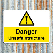 Danger Unsafe Structure signs are to warn people to stay away from a building or structure that poses a safety risk due to damage, instability, or deterioration. This sign alerts the public, workers, or emergency personnel that the structure is unstable and could collapse or cause injury. All our safety signs are compliant with BS EN ISO 7010 where applicable.
