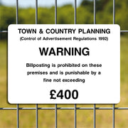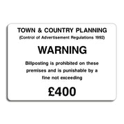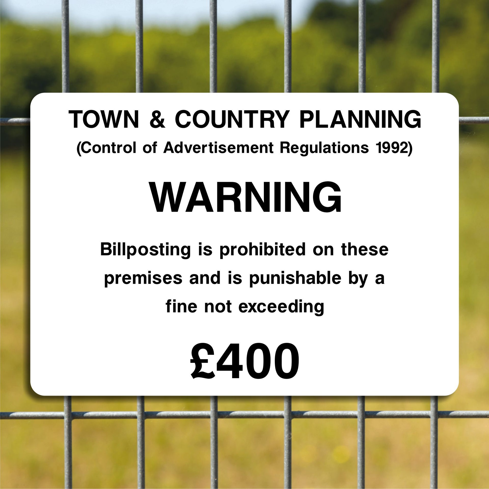 Town and Country Planning Signs are intended to deter people sticking posters advertising events on your building without permission? With the Town & Country Planning Sign, you can effectively communicate that billposting is strictly prohibited on your premises. All our safety signs are compliant with BS EN ISO 7010 where applicable.