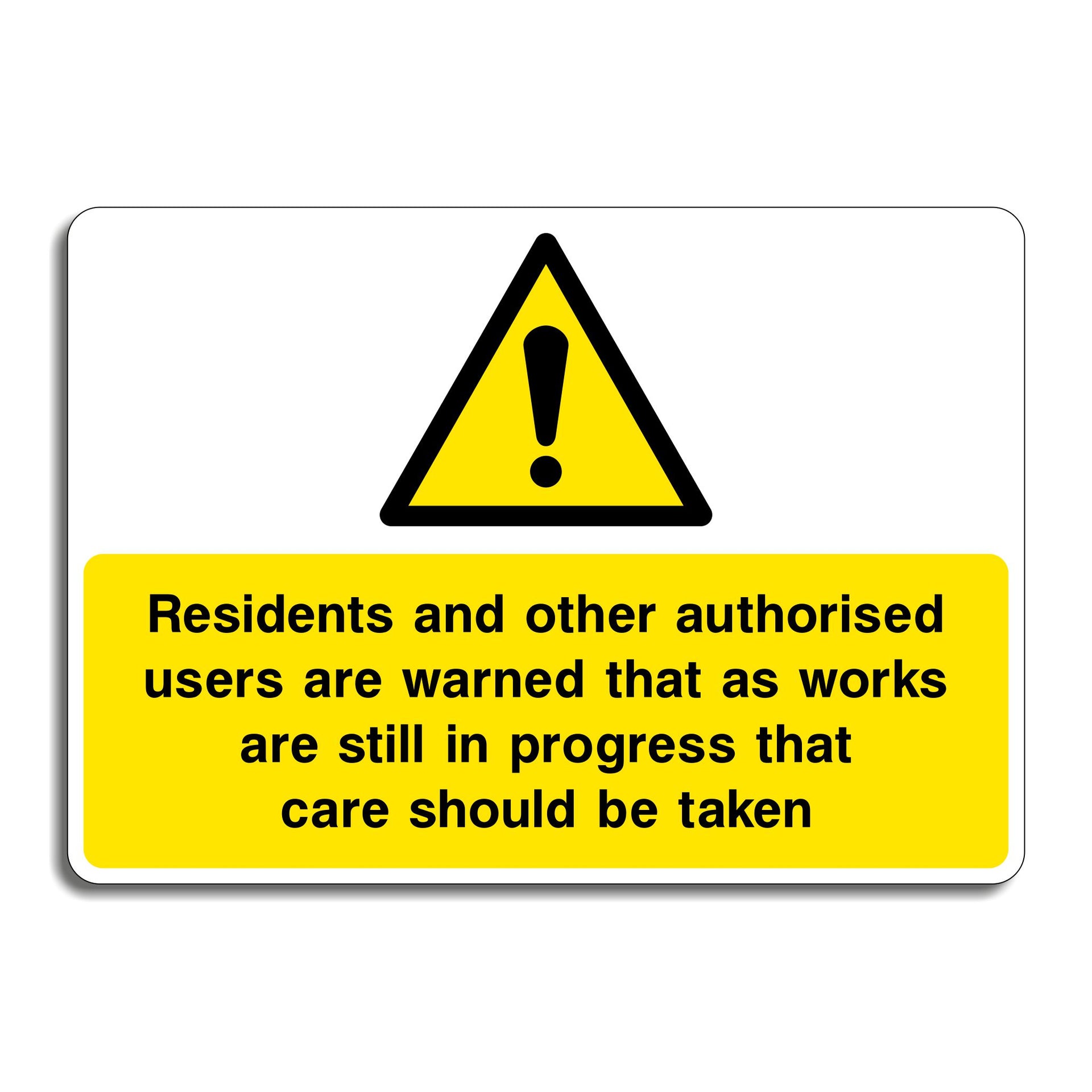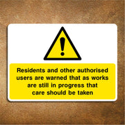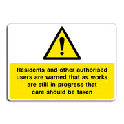 Works in Progress Sign. This sign warns residents and other authorised users that works are still in progress that care should be taken. This helps to maintain a safe environment for everyone involved whilst works are ongoing. All our safety signs are compliant with BS EN ISO 7010 where applicable.