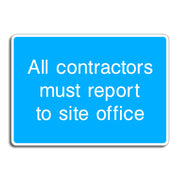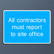 All Contractors Must Report to Site Office Signs are used on construction sites, industrial areas, and other controlled environments to manage contractor access and ensure proper procedures are followed. The sign ensures that all contractors check in before entering, helping to monitor who is on-site and when. All our safety signs are compliant with BS EN ISO 7010 where applicable.