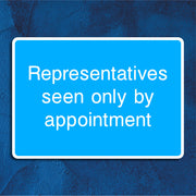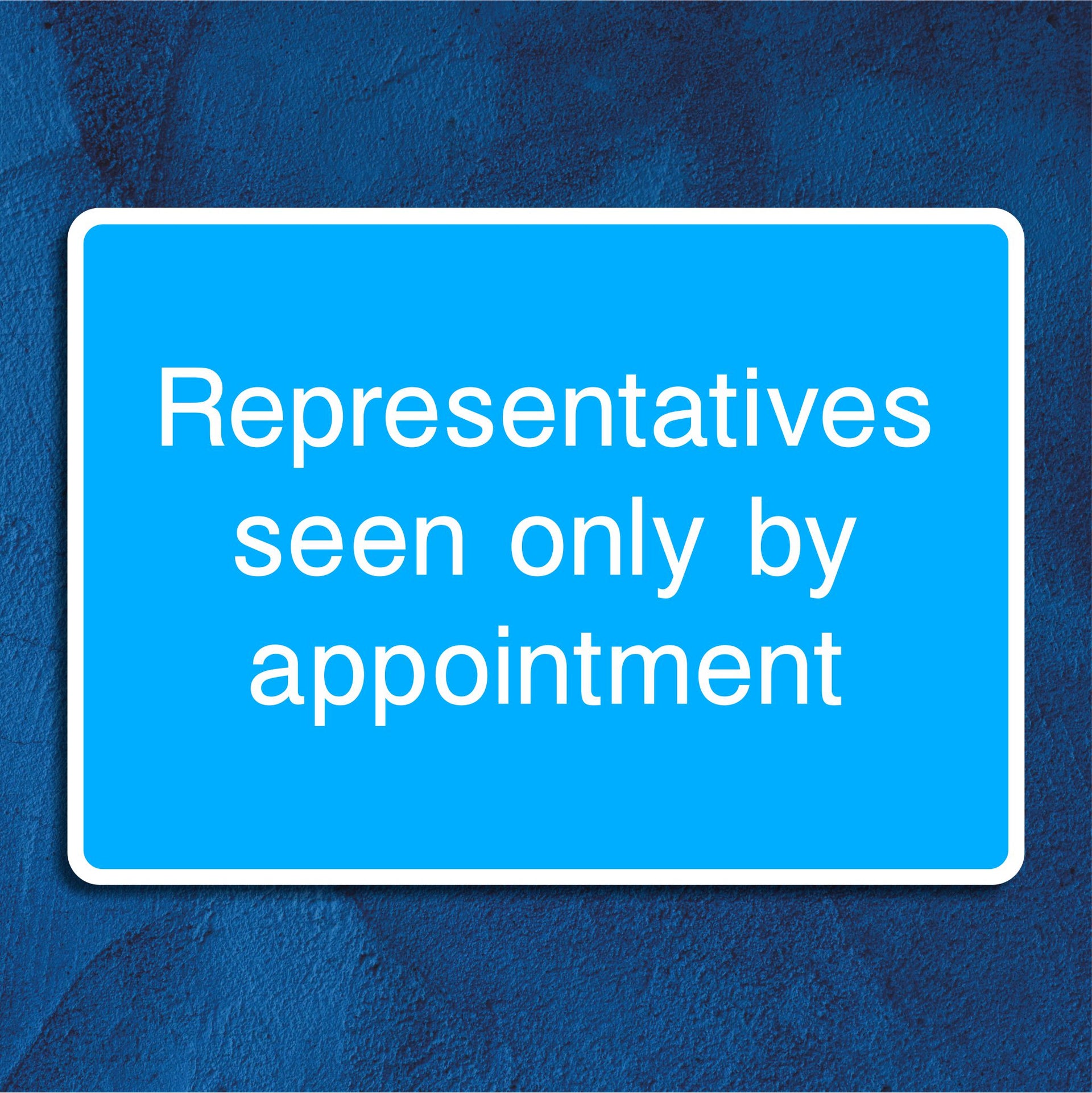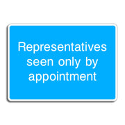 Representatives Seen Only by Appointment Signs are typically placed at reception areas, office entrances, or service counters to manage visits from sales representatives, vendors, or external agents. The sign helps prevent unplanned interruptions by making it clear that representatives cannot drop in without prior arrangement. All our safety signs are compliant with BS EN ISO 7010 where applicable.