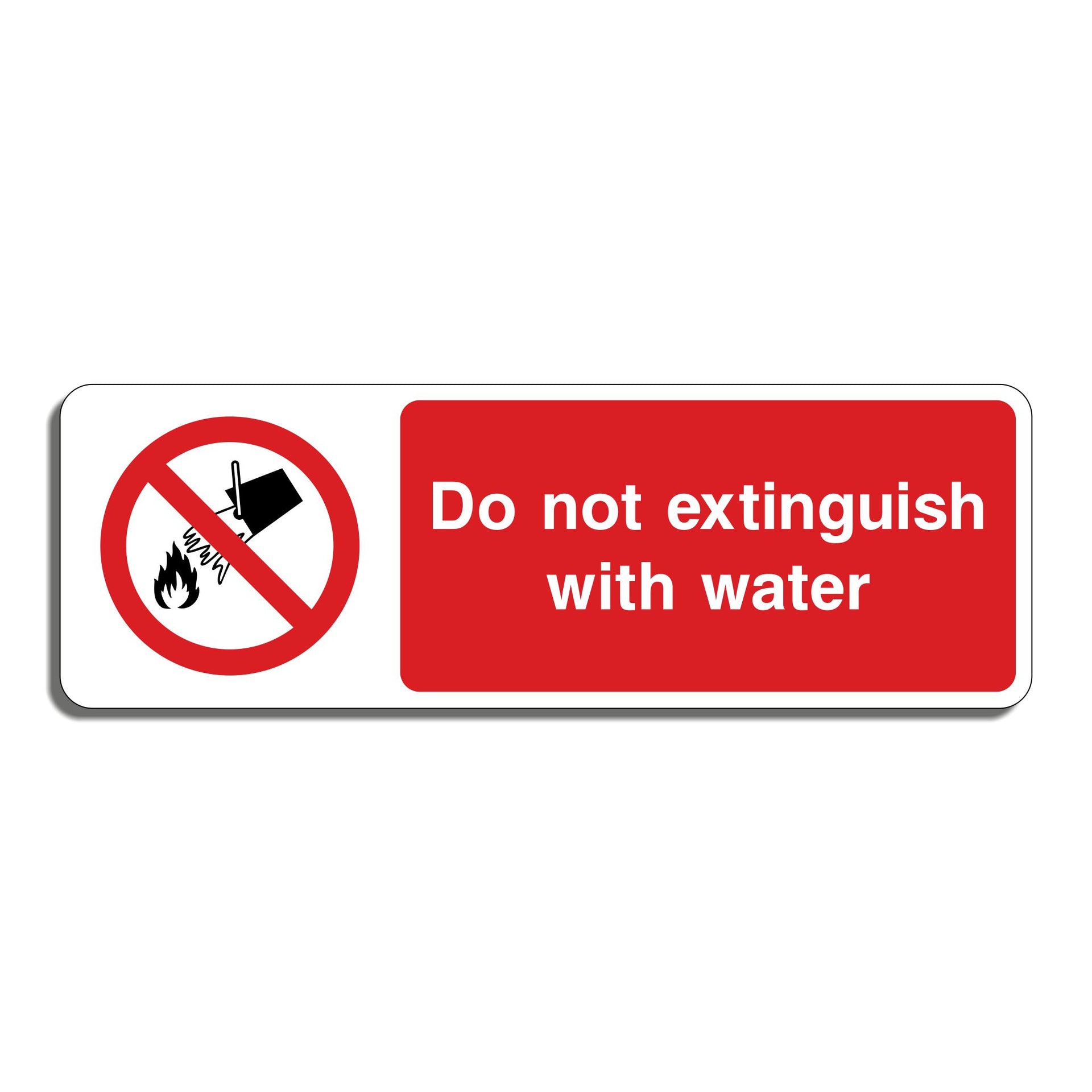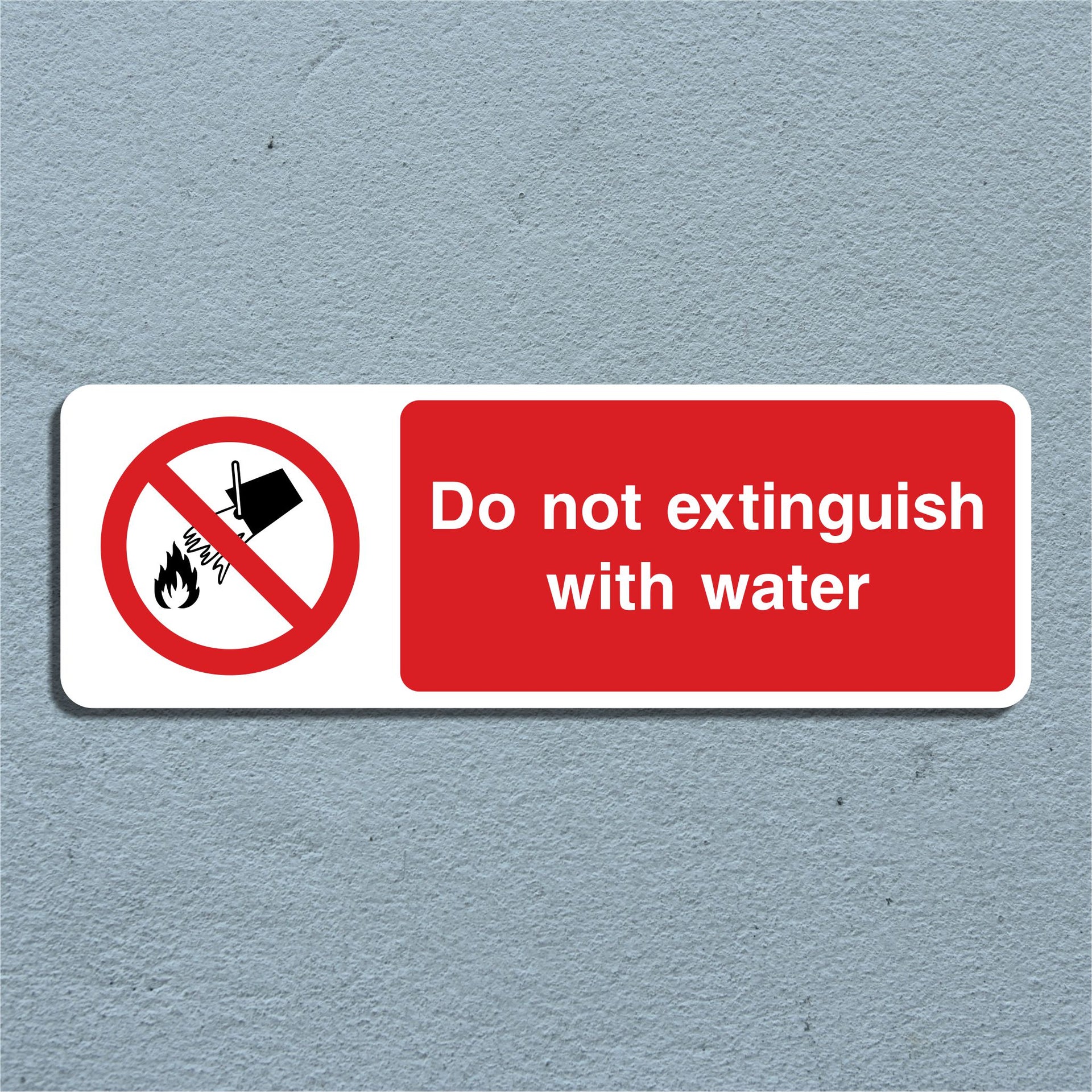 Do Not Extinguish With Water Signs are used to warn people not to use water to put out certain types of fires because doing so could be dangerous or make the fire worse. Some fires involve materials like electrical equipment, flammable liquids, or reactive metals that can cause explosions, electrical shocks, or spread the fire if water is used. These signs guide people to use the correct type of fire extinguisher (e.g., foam, CO₂, dry powder) for specific fire classes. All our safety signs are compliant with BS EN ISO 7010 where applicable.