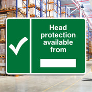 Head Protection Is Available From Signs are safety signs that inform people where they can obtain head protection, such as hard hats or safety helmets, within a workplace or site. With a panel to write your own specific information these signs are commonly used in construction zones, manufacturing plants, warehouses, and other environments where there is a risk of head injury from falling objects, overhead hazards, or moving equipment. All our safety signs are compliant with BS EN ISO 7010 where applicable.