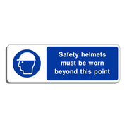 Safety Helmets Must Be Worn Beyond This Point Signs are mandatory safety signs used to clearly indicate that anyone passing beyond a specific location must wear a safety helmet (hard hat). These signs are most commonly seen at the entrance to construction sites, industrial zones, or any area where there is a risk of head injury from overhead hazards. All our safety signs are compliant with BS EN ISO 7010 where applicable.