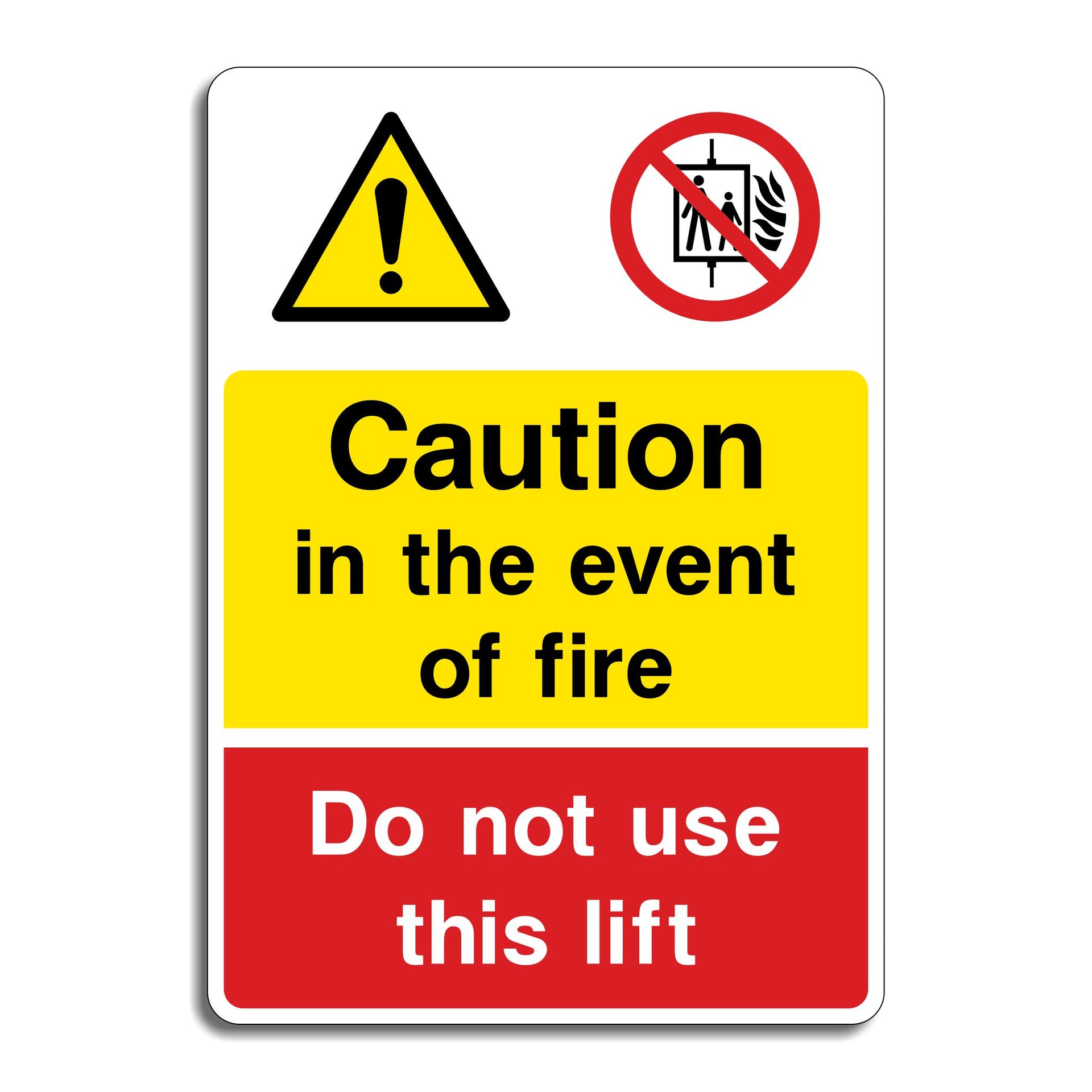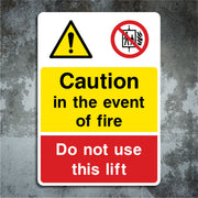 Caution In the Event of Fire, Do Not Use This Lift Signs are used to warn individuals that a lift should not be used during a fire emergency. These signs are typically displayed near or on lifts in public buildings, office buildings, hospitals, and other facilities where lifts are in use. All our safety signs are compliant with BS EN ISO 7010 where applicable.