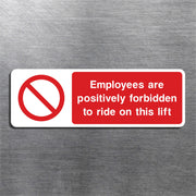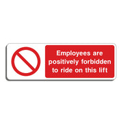 Employees Are Positively Forbidden To Ride On This Lift Signs are used to strictly prohibit staff from using certain lifts or hoists for personal transport. The lift is likely designed for goods only, not people. Riding it could result in serious injury or death. These signs help to reinforce that the lift must only be used for its intended function, transporting materials or cargo, not personnel. All our safety signs are compliant with BS EN ISO 7010 where applicable.