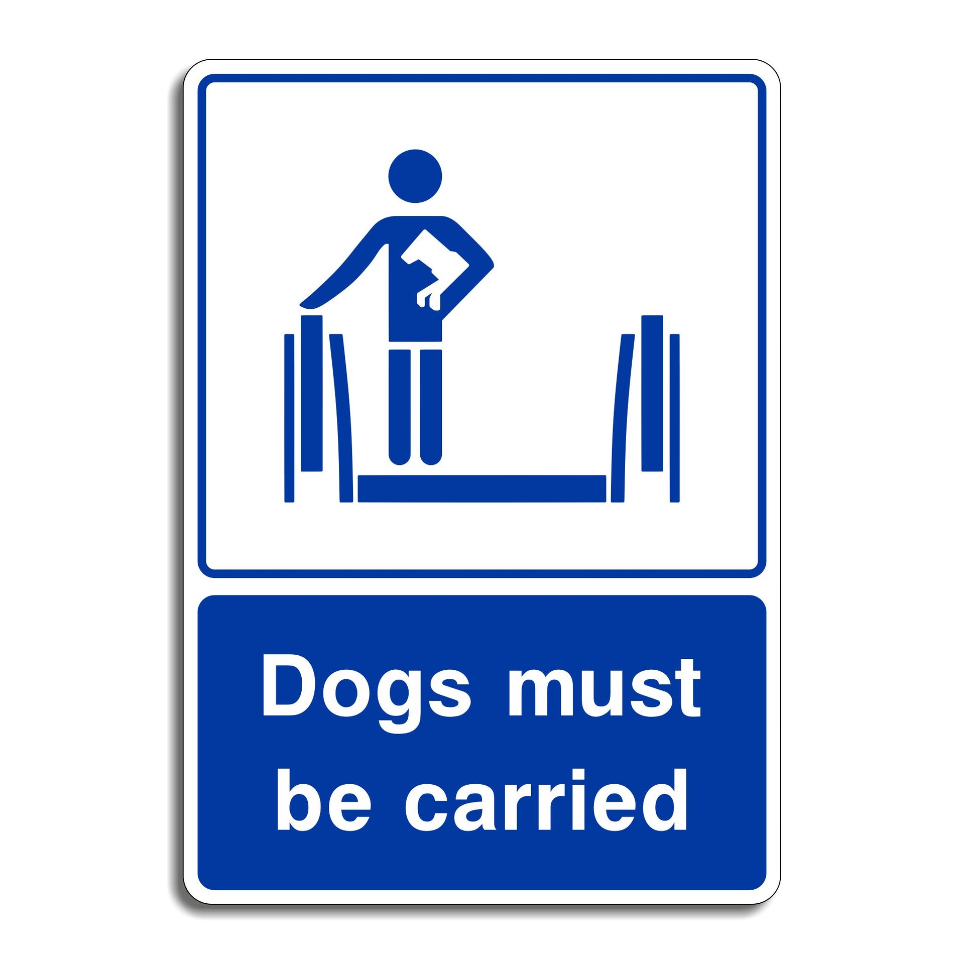 Dogs Must Be Carried on Escalator Signs are used to inform dog owners that they are required to carry their dogs while using an escalator. These signs are typically displayed in areas where escalators are present in places like shopping centers, train stations, airports, and other public spaces. All our safety signs are compliant with BS EN ISO 7010 where applicable.