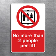 No More Than 2 People Per Lift Signs are used to clearly indicate a strict occupancy limit for a specific lift, typically due to safety, size, or weight capacity restrictions. These signs are commonly found in small residential or platform lifts, wheelchair-accessible lifts, construction site or service hoists and maintenance or goods lifts adapted for limited personnel use. All our safety signs are compliant with BS EN ISO 7010 where applicable.