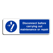 Disconnect Before Carrying Out Maintenance or Repair Signs are safety instructions that remind individuals to disconnect power sources or shut down equipment before performing any maintenance or repair work. These signs are typically found in environments where electrical equipment, machinery, or systems are being serviced or repaired, such as factories, warehouses, laboratories, or construction sites. All our safety signs are compliant with BS EN ISO 7010 where applicable.