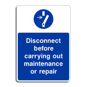 Disconnect Before Carrying Out Maintenance or Repair Signs are safety reminders placed on or near electrical equipment and machinery to ensure that workers or technicians disconnect the equipment from the power source before performing maintenance or repair activities. This simple yet critical safety precaution helps prevent electrical accidents, equipment damage, and ensures that the work is carried out in a safe and compliant manner. All our safety signs are compliant with BS EN ISO 7010 where applicable.