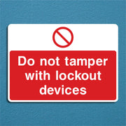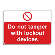 Do Not Tamper With Lockout Devices Signs are safety signs used to inform and remind workers that lockout devices should not be interfered with, tampered with, or removed by anyone other than the authorized personnel who applied them. These devices are part of a lockout/tagout (LOTO) procedure, and this sign ensures that safety protocols are strictly followed during maintenance or repair work to prevent accidents or injuries. All our safety signs are compliant with BS EN ISO 7010 where applicable.