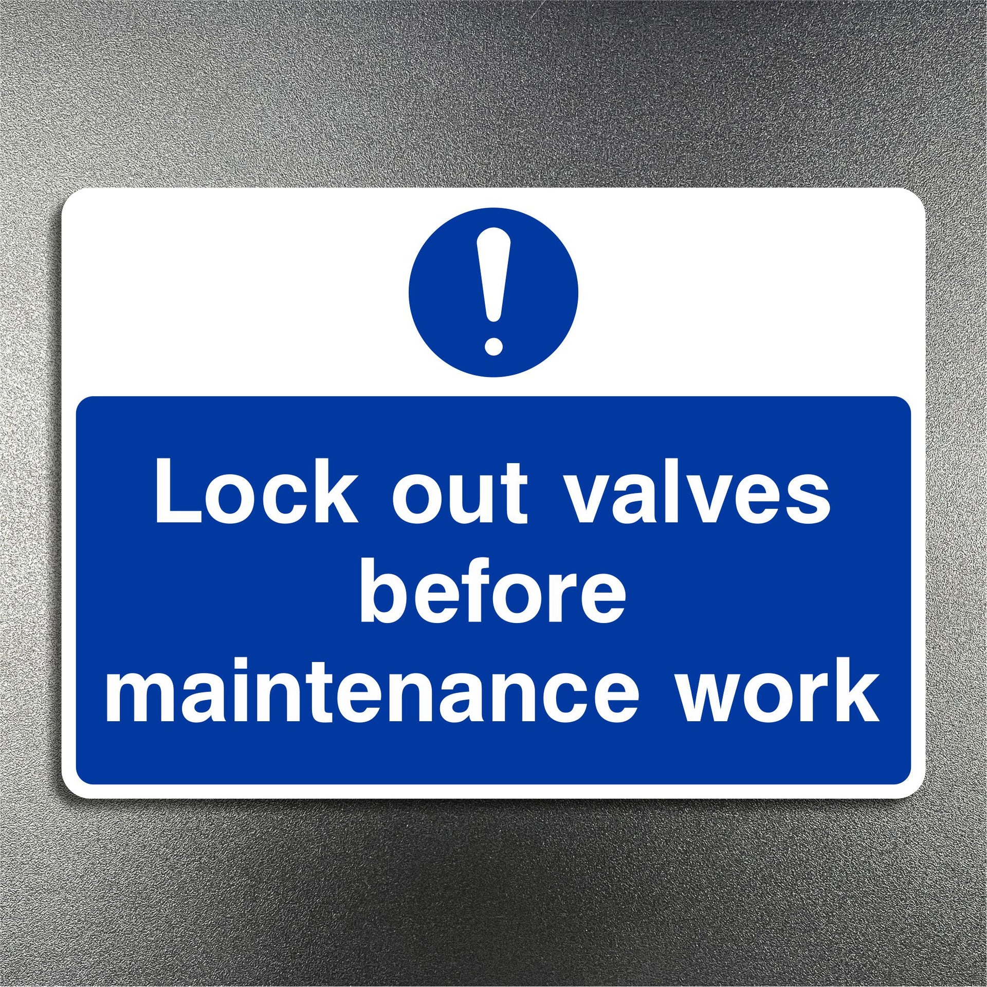 Lock Out Valves Before Maintenance Work Signs are a safety instruction used in industrial, mechanical, and plumbing systems to ensure pressurized fluids or gases are safely isolated before any maintenance, inspection, or repair begins. All our safety signs are compliant with BS EN ISO 7010 where applicable.
