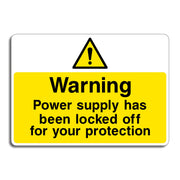 Warning Power Supply Has Been Locked Off For Your Protection Signs are used to inform and warn people that the power supply to a particular piece of equipment or system has been intentionally shut off and locked to ensure safety. They reassure workers and operators that the equipment is in a de-energized state, reducing the risk of electric shock, burns, or mechanical hazards. All our safety signs are compliant with BS EN ISO 7010 where applicable.