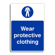 Wear Protective Clothing Signs are mandatory safety signs that instruct individuals to wear appropriate protective garments, such as coveralls, lab coats, chemical-resistant suits, or other specialized clothing, in certain areas or during specific tasks. The primary purpose of these signs is to protect the wearer from hazardous substances or dangerous conditions in the workplace. All our safety signs are compliant with BS EN ISO 7010 where applicable.