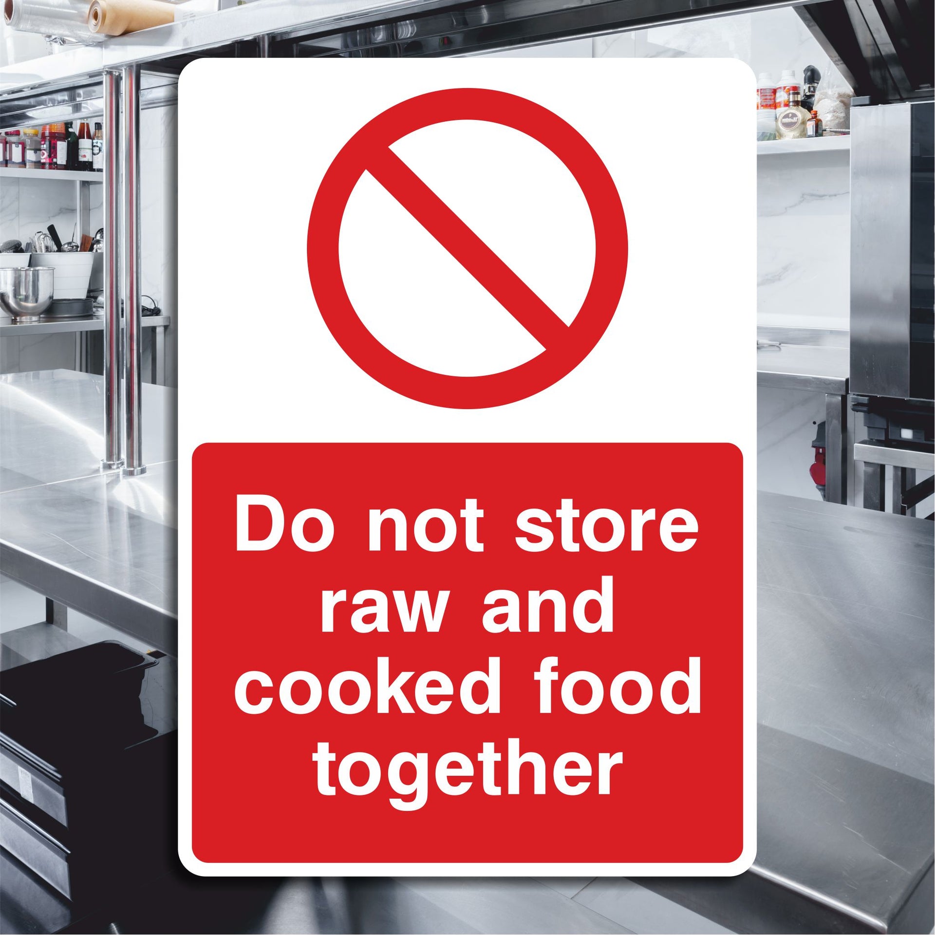 Do Not Store Raw and Cooked Food Together Signs are commonly used in commercial kitchens, restaurants, food storage areas, and food processing facilities to prevent the improper storage of raw and cooked foods in close proximity. Raw foods, particularly raw meat, poultry, and seafood, can carry harmful bacteria like Salmonella, E. coli, or Listeria. Storing these alongside cooked foods can lead to the contamination of ready-to-eat items, posing a significant risk of foodborne illnesses. This sign helps maintain strict separation between raw and cooked foods to ensure food safety. All our safety signs are compliant with BS EN ISO 7010 where applicable.