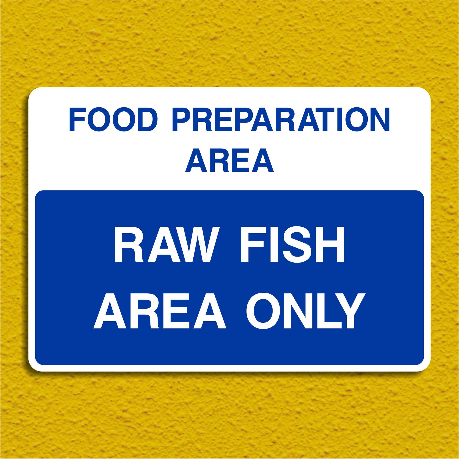 Food Preparation Area Raw Fish Area Only Signs are used in commercial kitchens, seafood processing plants, sushi bars, and catering facilities to designate a specific area for handling and preparing raw fish. Raw fish can carry harmful pathogens like Listeria, Salmonella, or parasites. These signs help ensure that raw fish is prepared in a separate, controlled area—away from cooked foods, meat, or ready-to-eat items. All our safety signs are compliant with BS EN ISO 7010 where applicable.