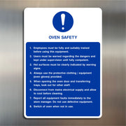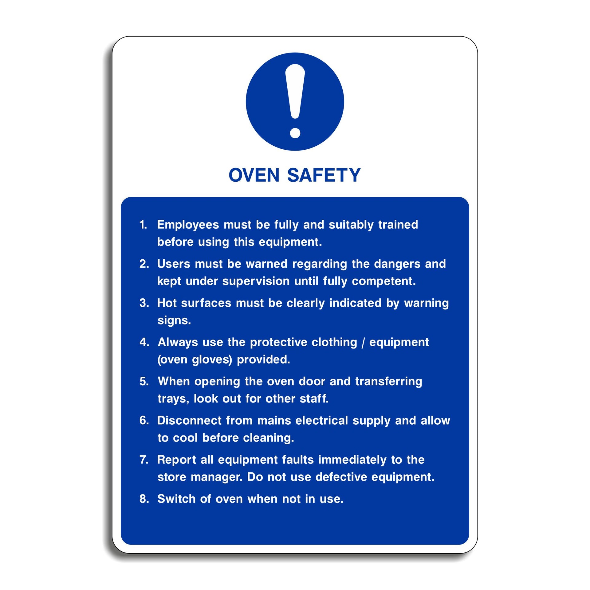 Oven Safety Guidance Signs are safety signs designed to communicate multiple important safety precautions and operating guidelines for working with ovens, particularly in environments like kitchens, bakeries, or industrial food production settings. The primary purpose of these signs is to ensure safe usage, reduce the risk of accidents or injuries, and provide clear instructions for safe operation, maintenance, and emergency procedures related to oven use. All our safety signs are compliant with BS EN ISO 7010 where applicable.