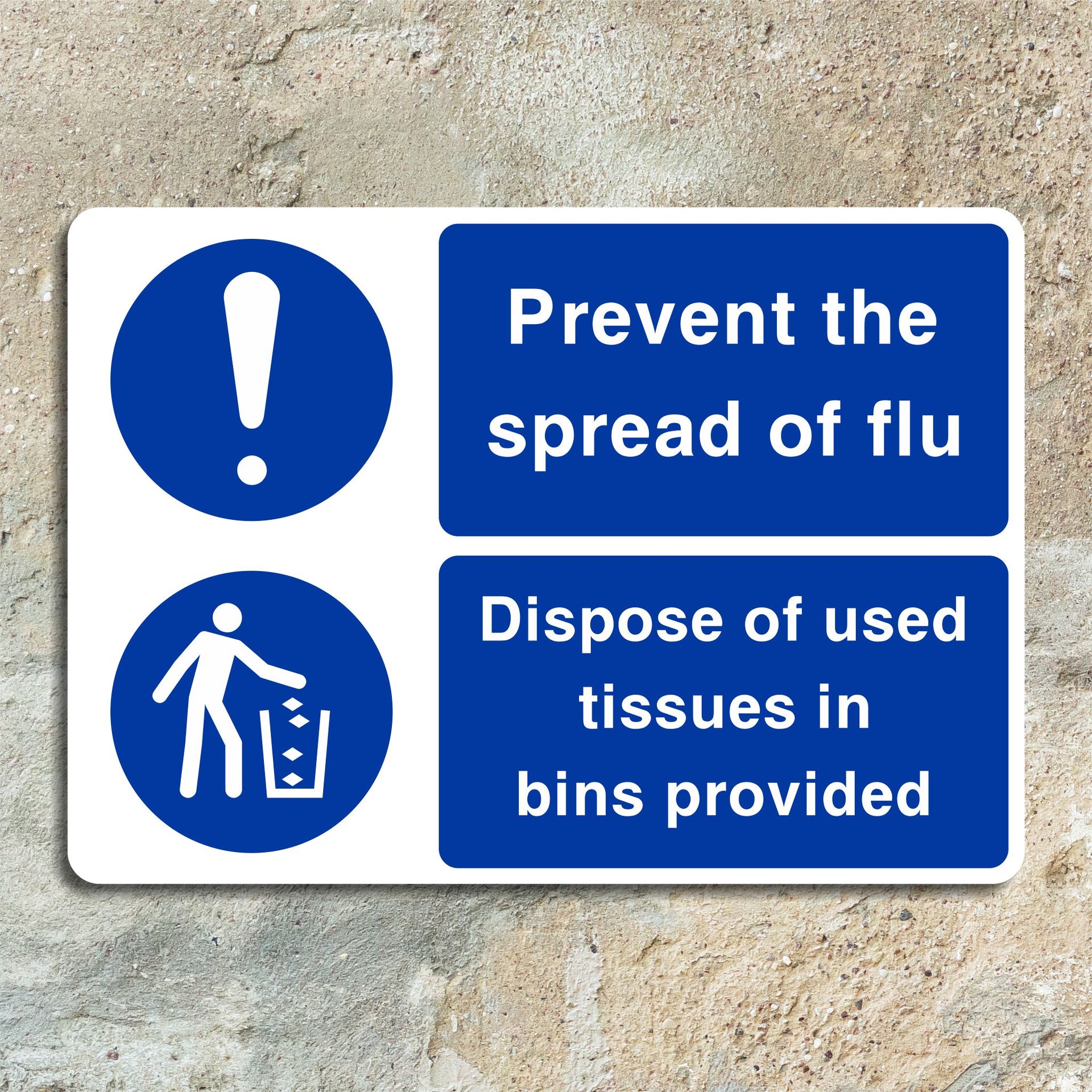 Prevent the Spread of Flu Dispose of Used Tissues in Bins Provided Signs are used in public spaces, workplaces, healthcare settings, schools, and other environments to remind individuals to properly dispose of used tissues and reduce the transmission of the flu virus. Used tissues, especially those contaminated with respiratory droplets from coughing or sneezing, can harbor flu viruses. These signs remind individuals to dispose of used tissues immediately in designated bins, helping prevent the spread of germs to other surfaces or people. All our safety signs are compliant with BS EN ISO 7010 where applicable.
