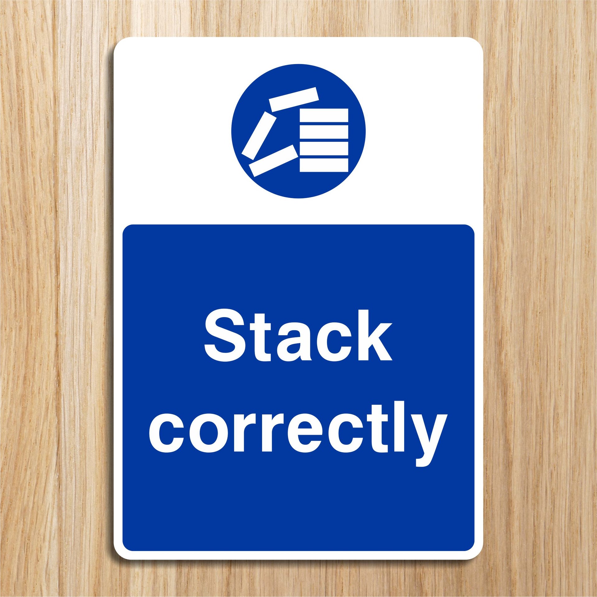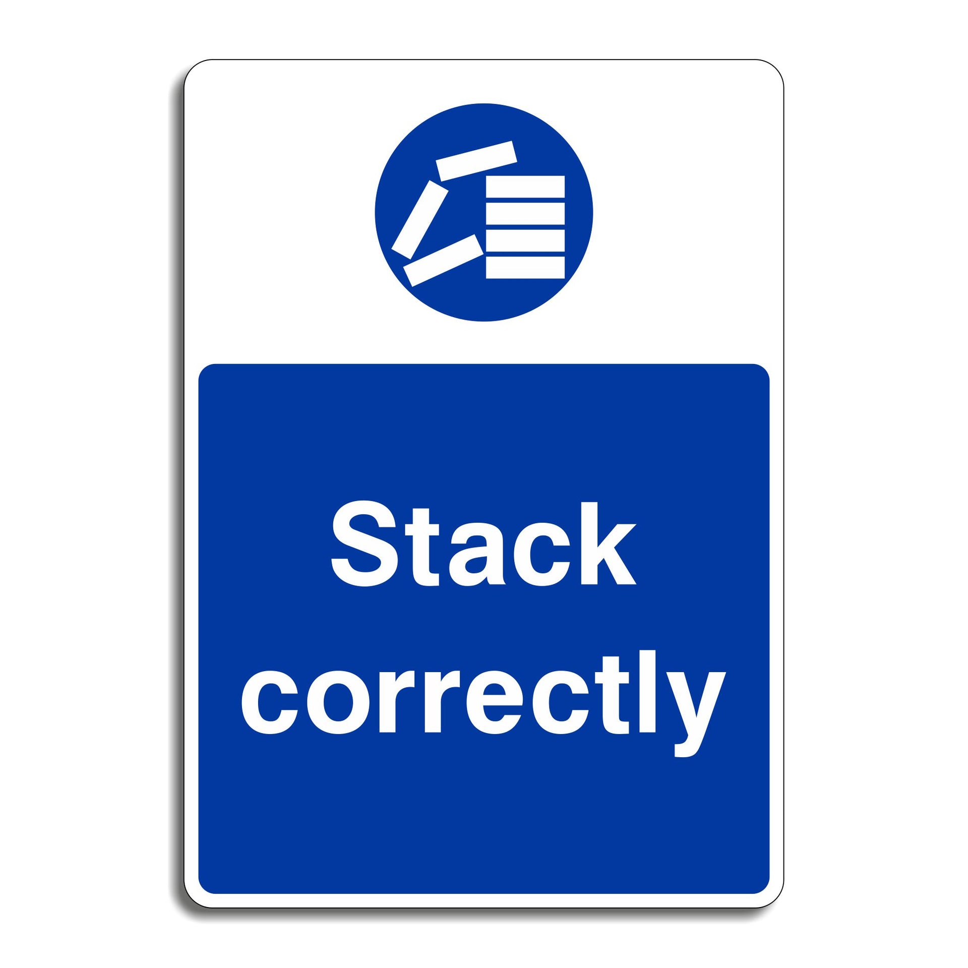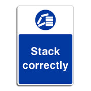 Stack Correctly Signs are safety reminders that instruct individuals to organize and stack materials, goods, or equipment in a safe and stable manner to prevent accidents or injuries in the workplace. These signs are commonly found in environments like warehouses, factories, construction sites, storage areas, or retail environments where materials are regularly stacked or stored. All our safety signs are compliant with BS EN ISO 7010 where applicable.