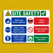 Site Safety Multi Message Sign - Infection Control. Site Safety multi-message signs provide clear, essential safety information to everyone on or near a construction or work site, helping to prevent accidents, injuries, and unauthorized access. This particular sign is designed for infection control on your site. All our safety signs are compliant with BS EN ISO 7010 where applicable.