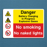 Danger Battery Charging in Progress Explosive Gases No Smoking Naked Lights Sign