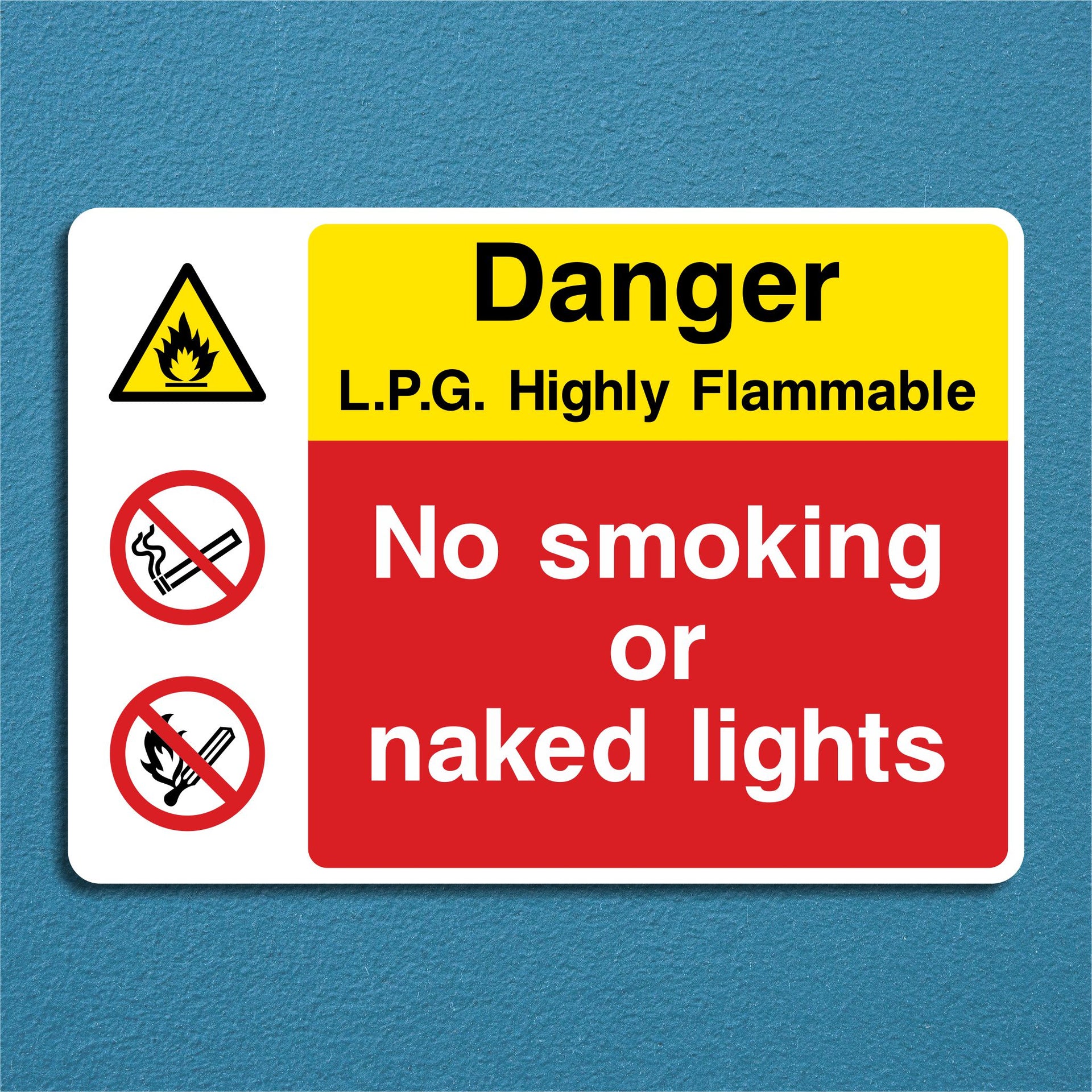 Danger L.P.G. Highly Flammable Liquid No Smoking or Naked Lights Signs are critical safety warnings placed in areas where Liquefied Petroleum Gas (LPG) is stored, transferred, or used. Their primary purpose is to prevent fires or explosions by controlling ignition sources around a highly flammable substance. All our safety signs are compliant with BS EN ISO 7010 where applicable.