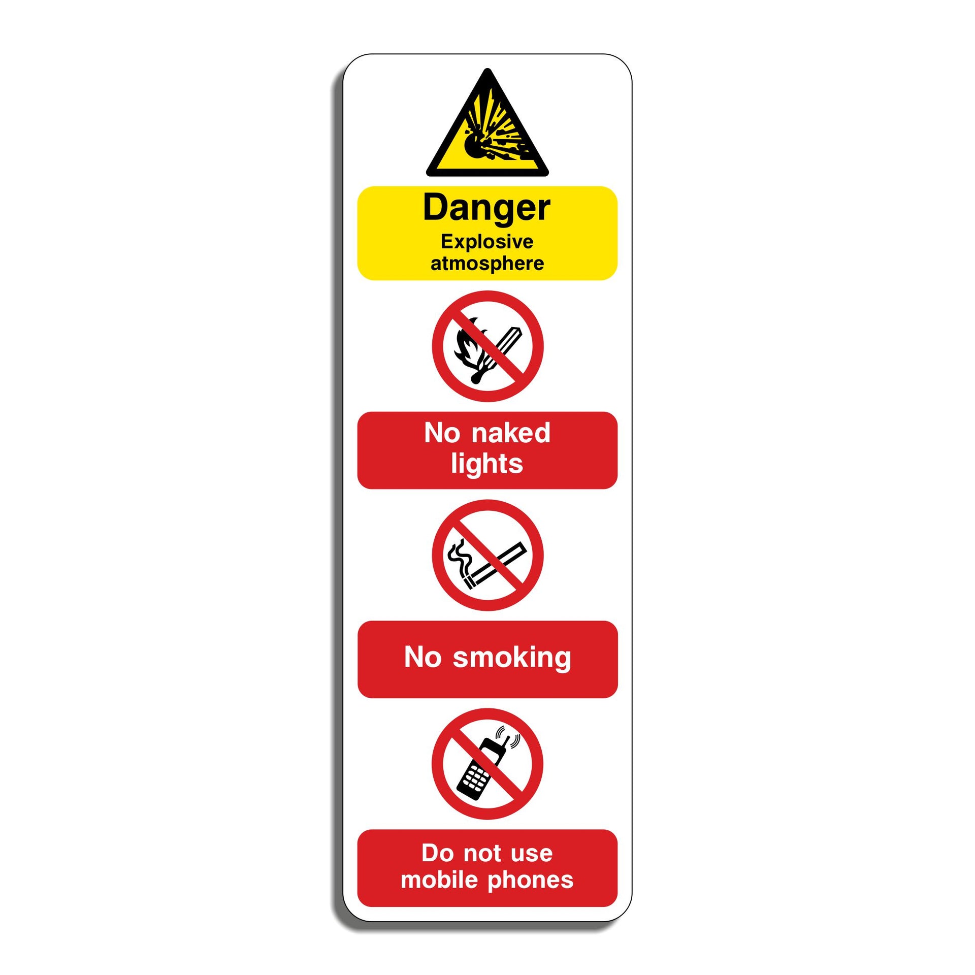 Workshop Multi-message Safety Signs are designed to communicate multiple important safety instructions or warnings in one sign. Their purpose is to enhance safety awareness by combining several safety messages in a single, clearly visible display, especially in environments where various hazards exist. They are used in garages, workshop and other commercial settings that involve mechanical, electrical, chemical, and fire risks. Multi-message signs allow several warnings (e.g., "No Naked Lights", "Danger Explosive Atmosphere", "No Smoking") to be shown together, improving hazard awareness without needing multiple separate signs. All our safety signs are compliant with BS EN ISO 7010 where applicable.