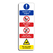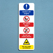 Swich Off Engine Garage Multi-message Safety Signs are designed to communicate multiple important safety instructions or warnings in one sign. Their purpose is to enhance safety awareness by combining several safety messages in a single, clearly visible display, especially in environments where various hazards exist. They are used in garages, workshop and other commercial settings that involve mechanical, electrical, chemical, and fire risks. Multi-message signs allow several warnings (e.g., "No Naked Lights", "Danger Explosive Atmosphere", "No Mobile Phones" "Switch Off Engine") to be shown together, improving hazard awareness without needing multiple separate signs. All our safety signs are compliant with BS EN ISO 7010 where applicable.