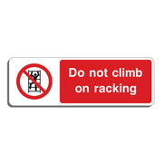Do Not Climb on Racking Signs are used to warn individuals not to climb on warehouse or industrial shelving systems (racking). Climbing on racking can lead to serious injuries from falls or collapsing shelves. These signs help prevent such accidents. Racking is designed to store goods, not support human weight. Climbing can damage the structure or cause stored items to fall, leading to injury or loss. All our safety signs are compliant with BS EN ISO 7010 where applicable.