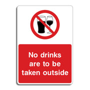 No Drinks Are To Be Taken Outside Signs are to inform customers or guests that beverages must remain within a designated area. Many establishments are legally required to restrict alcohol consumption to specific areas. This sign helps ensure compliance with liquor licensing regulations. Preventing drinks from being taken outside reduces the risk of broken glass, spills, or alcohol-related incidents on sidewalks or public property, helping to protect both patrons and the business from liability. All our safety signs are compliant with BS EN ISO 7010 where applicable.