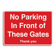 No Parking In Front Of These Gates Thank You Signs are used to politely inform drivers not to park in front of gates to ensure they remain accessible at all times. These signs are commonly placed on residential, commercial, or industrial properties where gate access is needed for vehicles, deliveries, or emergency services. All our safety signs are compliant with BS EN ISO 7010 where applicable.