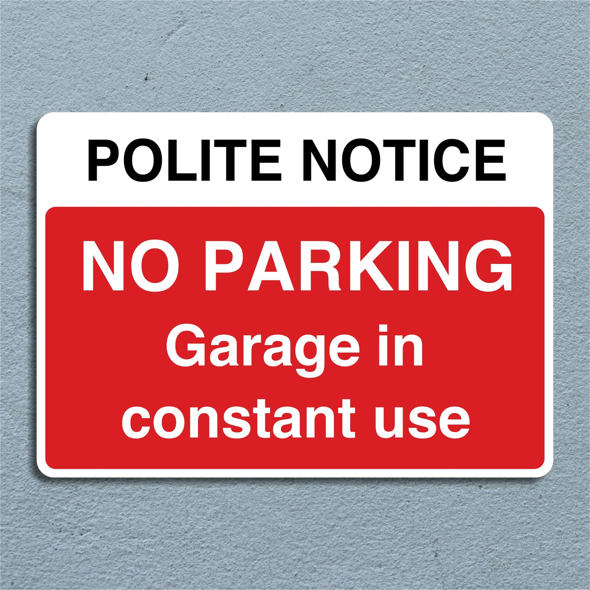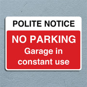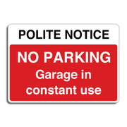 Polite Notice No Parking Garage In Constant Use Signs are intended to inform drivers that parking in front of the garage is not permitted because it is regularly used and must remain accessible at all times. The purpose of these signs is to prevent obstruction that could delay or block vehicles needing to enter or exit the garage, whether for residential, commercial, or emergency purposes. All our safety signs are compliant with BS EN ISO 7010 where applicable.