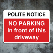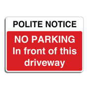 Polite Notice No Parking In Front Of This Driveway Signs are designed to clearly communicate that vehicles must not stop or park in front of this driveway. Their primary purpose is to ensure unimpeded access for property owners, emergency services, or authorized users who need to enter or exit the driveway at any time. All our safety signs are compliant with BS EN ISO 7010 where applicable.