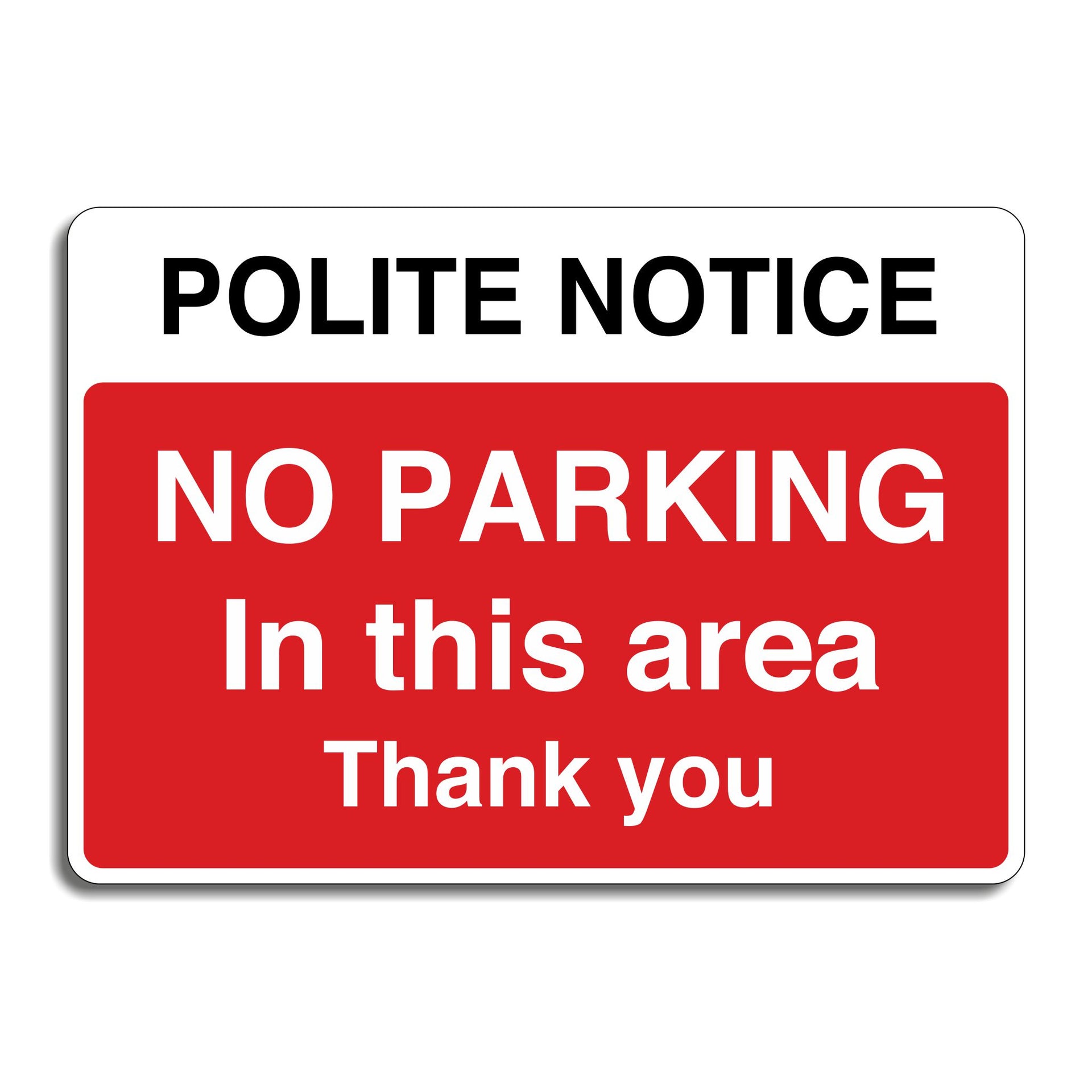 Polite Notice No Parking In This Area Thank You Signs are intended to inform drivers that stopping or leaving a vehicle in the designated area is not allowed. Their primary purpose is to maintain clear access for emergency vehicles, pedestrians, or traffic flow, and to prevent obstructions that could cause safety hazards or congestion. All our safety signs are compliant with BS EN ISO 7010 where applicable.