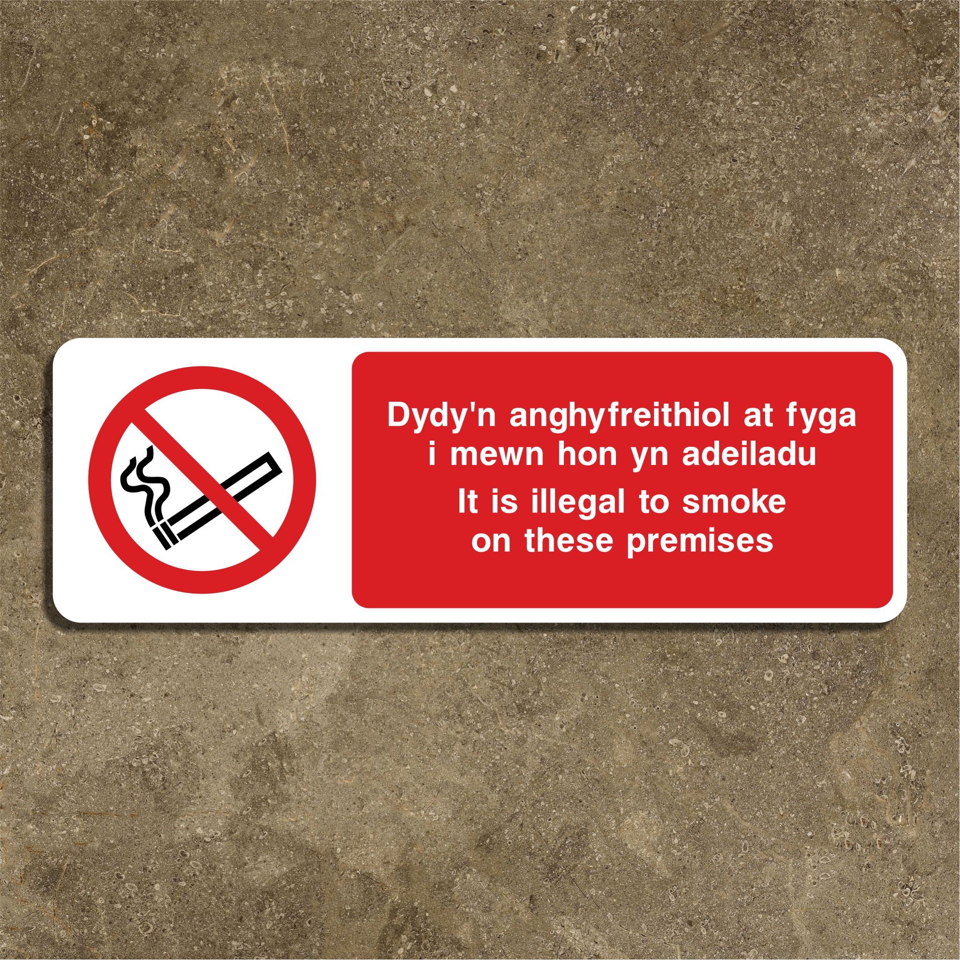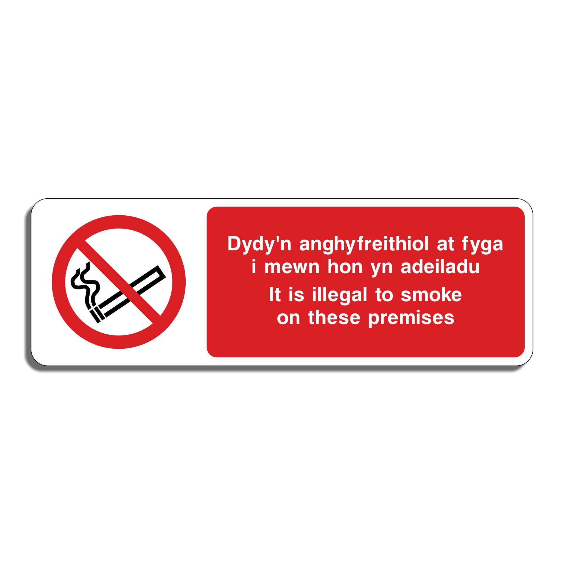 Dydy’n Anghyfreithiol At Fyga L Mewn Hon Yn Adeiladu It Is Illegal To Smoke On These Premises Signs are used to clearly communicate, in both Welsh and English, that smoking is legally prohibited within a specific building or area. The sign informs everyone that smoking is not just discouraged, but against the law, and may result in penalties such as fines. By presenting the message in both Welsh and English, the sign ensures that speakers of both languages understand the legal restriction, supporting language equality and cultural respect in Wales. All our safety signs are compliant with BS EN ISO 7010 where applicable.