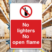 No Lighters No Open Flame Signs are used to clearly warn that open flames and ignition sources, such as lighters, matches, or torches, are strictly prohibited in a specific area. In environments where flammable gases, vapours, dust, or materials are present (such as fuel storage areas, laboratories, or chemical plants), any open flame or spark could trigger a fire or explosion. It reminds workers, visitors, and contractors that they are in a high-risk zone and must avoid using any flame-producing devices. All our safety signs are compliant with BS EN ISO 7010 where applicable.