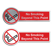 Our brushed aluminum No Smoking Beyond This Point Signs are known for their contemporary appeal, giving a high-end look that is both sleek as well as being practical. The distinctive brushed aluminium texture creates a modern aesthetic that is perfect for businesses or organisations aiming to convey a sense of style and professionalism. The textured metallic finish adds a touch of luxury, making brushed aluminum door signs a popular choice for any location. Manufactured by us here in the UK using a high quality 3mm brushed silver aluminium composite sheet each sign is suitable for either internal or external use. Our Crest range of signs are precision cut to size and shape using one of our flat bed CNC routers and is then digitally printed directly to the surface using the very latest UV printing technology. This Crest door sign is also available in a 3mm bright white aluminium composite finish. These signs are supplied with self adhesive pads to allow for easy installation. We also offer a range of stylish screw fixings that are designed to compliment the finish of each sign. Due to the large selection of different sign designs to avoid drill holes in the actual image or text area we do not supply these signs with any pre-drilled holes.
