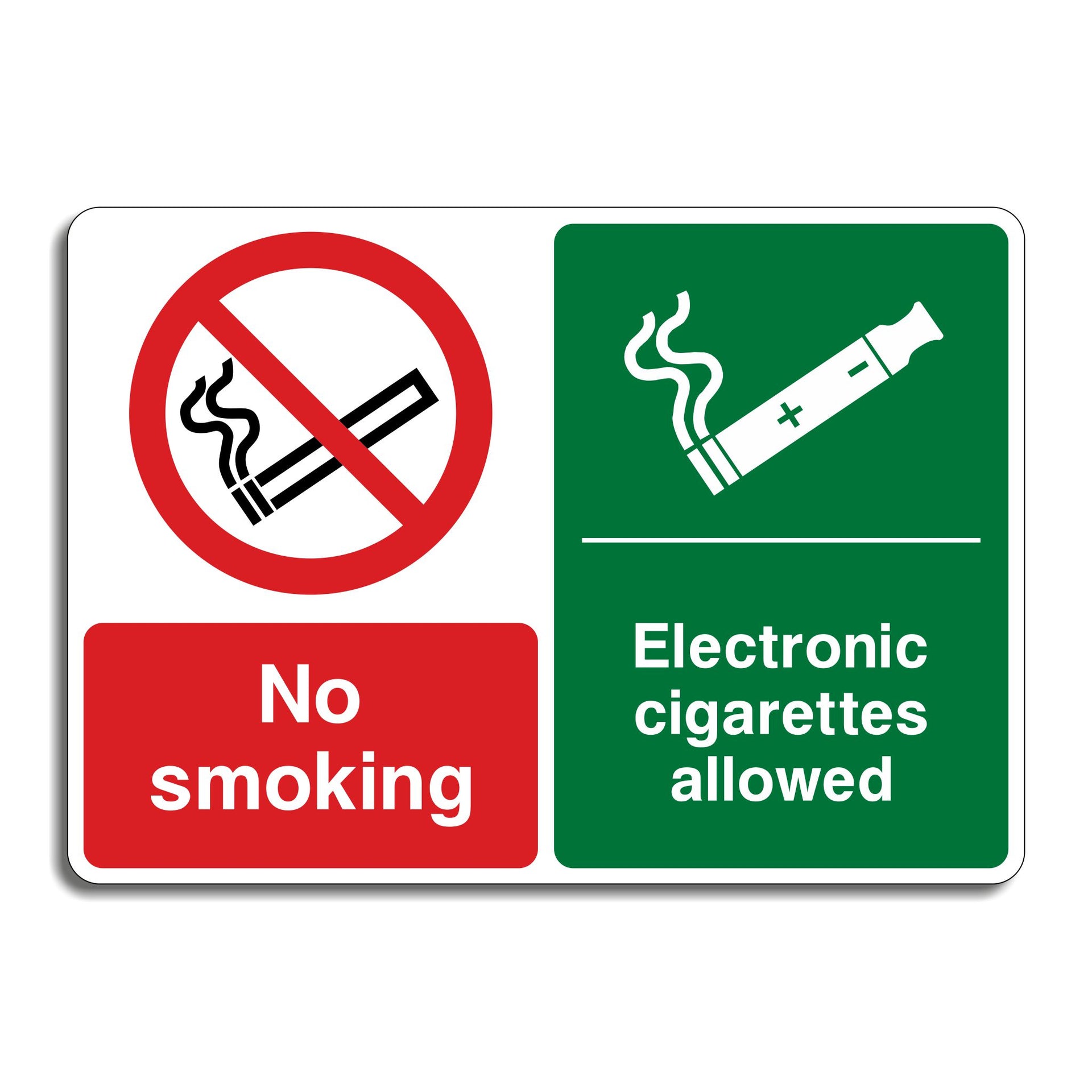No Smoking, Electronic Cigarettes Allowed Signs are used to clearly indicate a specific policy: traditional smoking is prohibited, but the use of electronic cigarettes is permitted in the area. The sign distinguishes between traditional smoking and vaping, helping users understand what is and isn’t allowed. Some workplaces, public areas, or private businesses choose to ban tobacco smoke due to health risks and odours but allow vaping as a less intrusive alternative. This sign helps enforce that policy. All our safety signs are compliant with BS EN ISO 7010 where applicable.