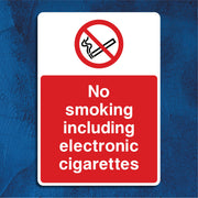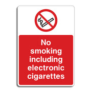 No Smoking Including Electronic Cigarettes Signs are used to clearly inform people that both traditional smoking and the use of electronic cigarettes (vaping) are prohibited in the designated area. By specifically mentioning e-cigarettes, the sign removes any ambiguity and ensures people understand that vaping is also not allowed, not just smoking tobacco. Both second hand smoke and vapor from electronic cigarettes can affect air quality and impact the health of others, especially in enclosed or public spaces.
