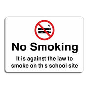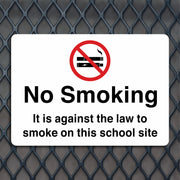 No Smoking It Is Against the Law to Smoke on This School Site Signs are used to clearly communicate that smoking is legally prohibited anywhere on school grounds, in accordance with public health laws and school policies. These signs serve as a visible deterrent to smokers, helping to maintain a healthy, smoke-free environment for students, staff, and visitors. All our safety signs are compliant with BS EN ISO 7010 where applicable.