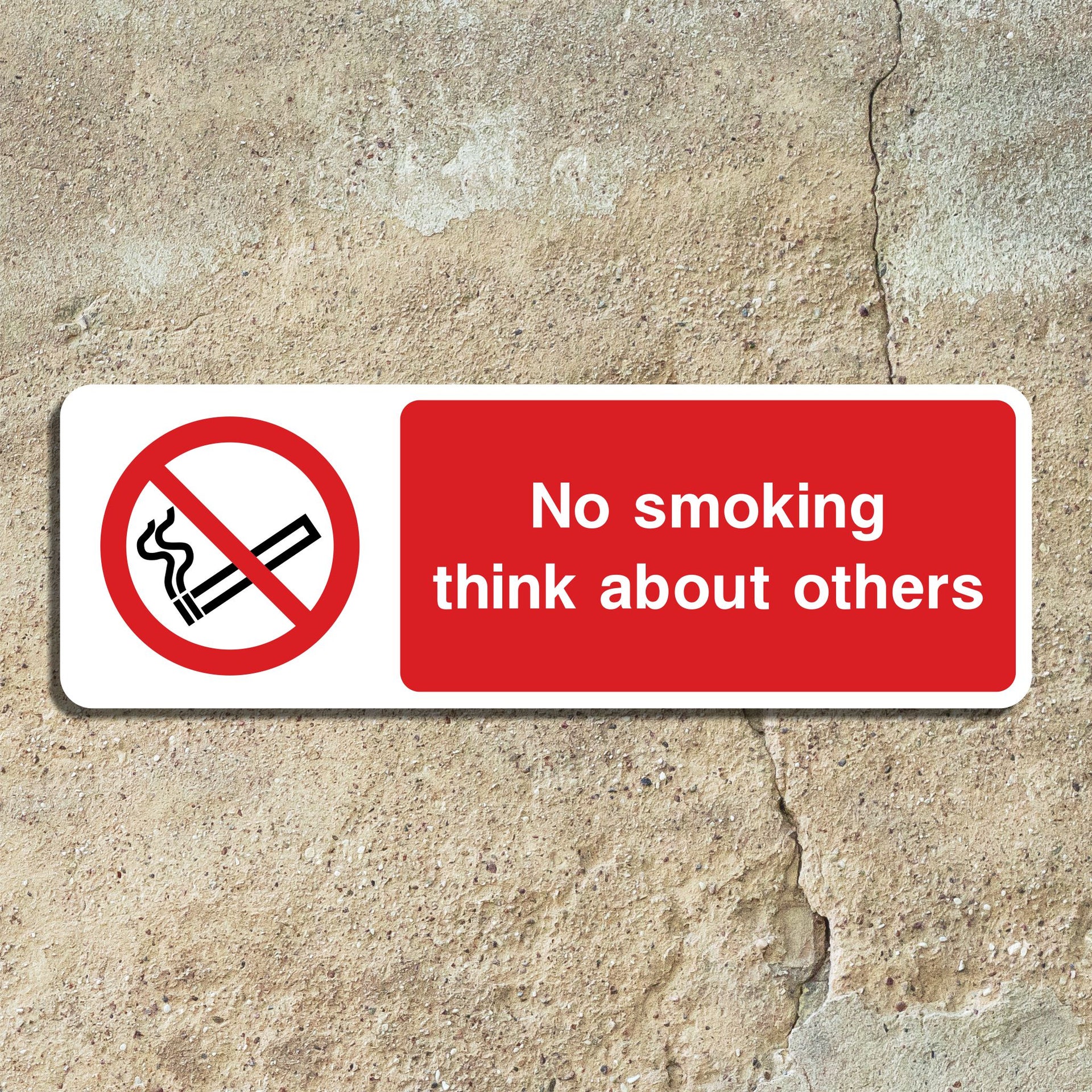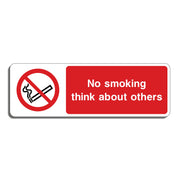 No Smoking Think About Others Signs are used to politely remind people not to smoke in a particular area while encouraging consideration for the health and comfort of others nearby. The message appeals to smokers’ sense of empathy, encouraging them to avoid smoking out of consideration for others. By asking people to think about others, the sign helps protect non-smokers from harmful second hand smoke. All our safety signs are compliant with BS EN ISO 7010 where applicable.