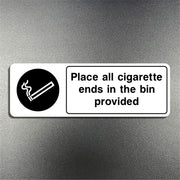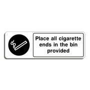 Place All Cigarette Ends In The Bin Provided Signs are used to instruct smokers to properly dispose of their cigarette butts in designated receptacles. They help keep the area free of litter by encouraging smokers to use the provided bins instead of discarding cigarette ends on the ground. Proper disposal in a designated bin, often designed to safely contain cigarette butts, reduces the risk of accidental fires caused by still-burning cigarette ends. All our safety signs are compliant with BS EN ISO 7010 where applicable.