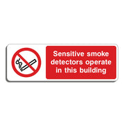 Sensitive Smoke Detectors Operate In This Building Signs are used to alert occupants and visitors that the building is equipped with highly sensitive smoke detection systems. By informing people that smoke detectors are very sensitive, the sign encourages caution when performing activities that might generate smoke or steam (like smoking, cooking, or using aerosols) to avoid triggering false alarms. All our safety signs are compliant with BS EN ISO 7010 where applicable.