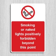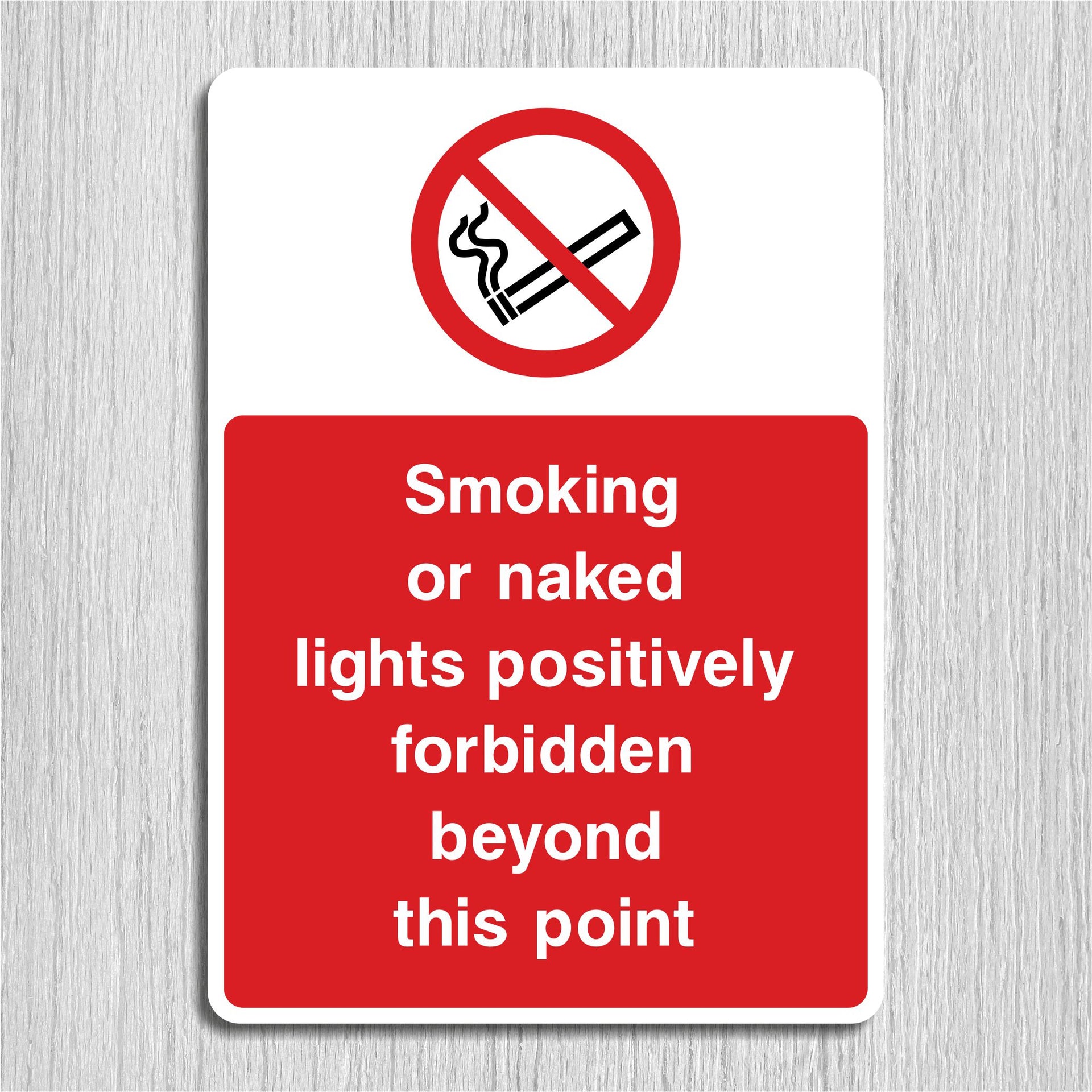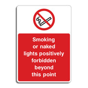 Smoking Or Naked Lights Positively Forbidden Beyond This Point Signs are safety warning signs used to prevent fires and explosions in areas where flammable substances or vapours may be present. Smoking and naked (open) flames, like matches, lighters, or torches, can easily ignite flammable gases, vapours, liquids, or dust. The sign warns that these activities or items are strictly prohibited to avoid accidental ignition. All our safety signs are compliant with BS EN ISO 7010 where applicable.