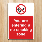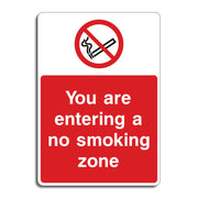 You Are Entering a No Smoking Zone Signs are used to alert people that they are about to enter an area where smoking is strictly prohibited. They give smokers a clear instructions to stop smoking before entering the designated smoke-free area. By identifying smoke-free zones, these signs help reduce exposure to harmful second hand smoke for everyone inside. In places where smoking could pose fire or explosion risks, like hospitals or schools the signs help prevent dangerous incidents. All our safety signs are compliant with BS EN ISO 7010 where applicable.