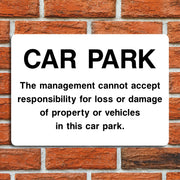 Car Park Disclaimer Signs are typically placed in parking areas to inform drivers that the car park management is not liable for any damage or loss that occurs to vehicles or their contents while parked in the facility. These signs are commonly found in public parking lots, shopping centers, commercial parking garages, and event venues. All our safety signs are compliant with BS EN ISO 7010 where applicable.