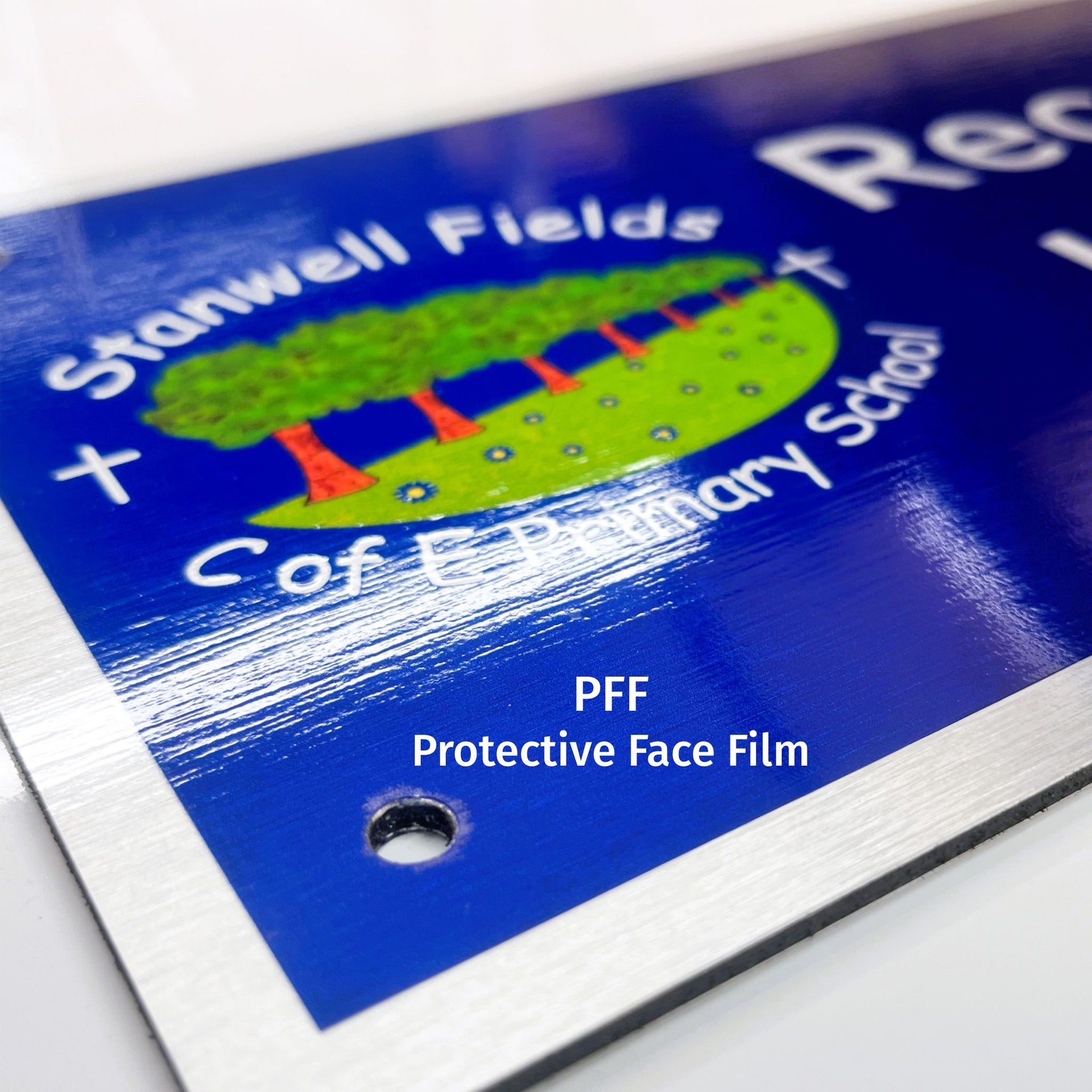 Now Available... PFF is a clear protective face film that can be applied to our aluminium composite signs during the manufacturing process. PFF is a high quality polymeric clear film that gives your signs even greater protection against the long term effects of UV exposure, damage from spray paints, solvent and water based marker pens, airborne salt, sea spray and everyday dirt and road grime.