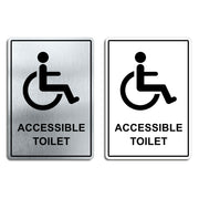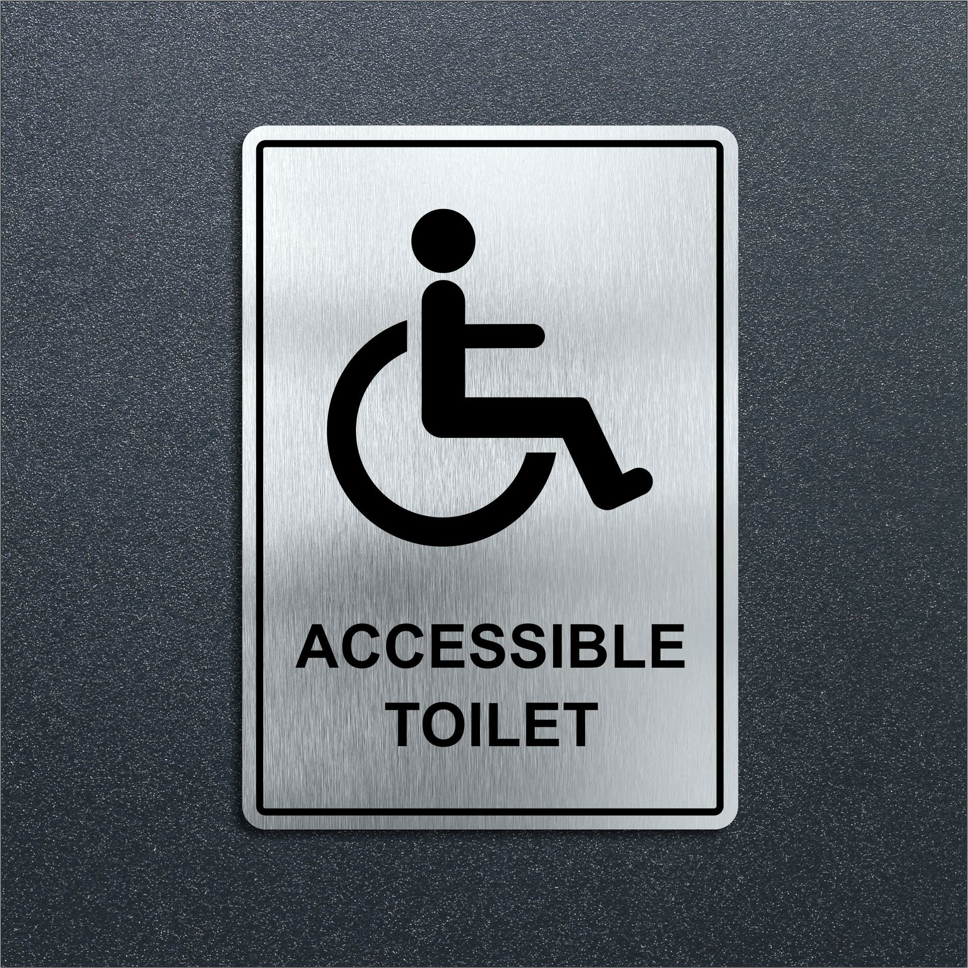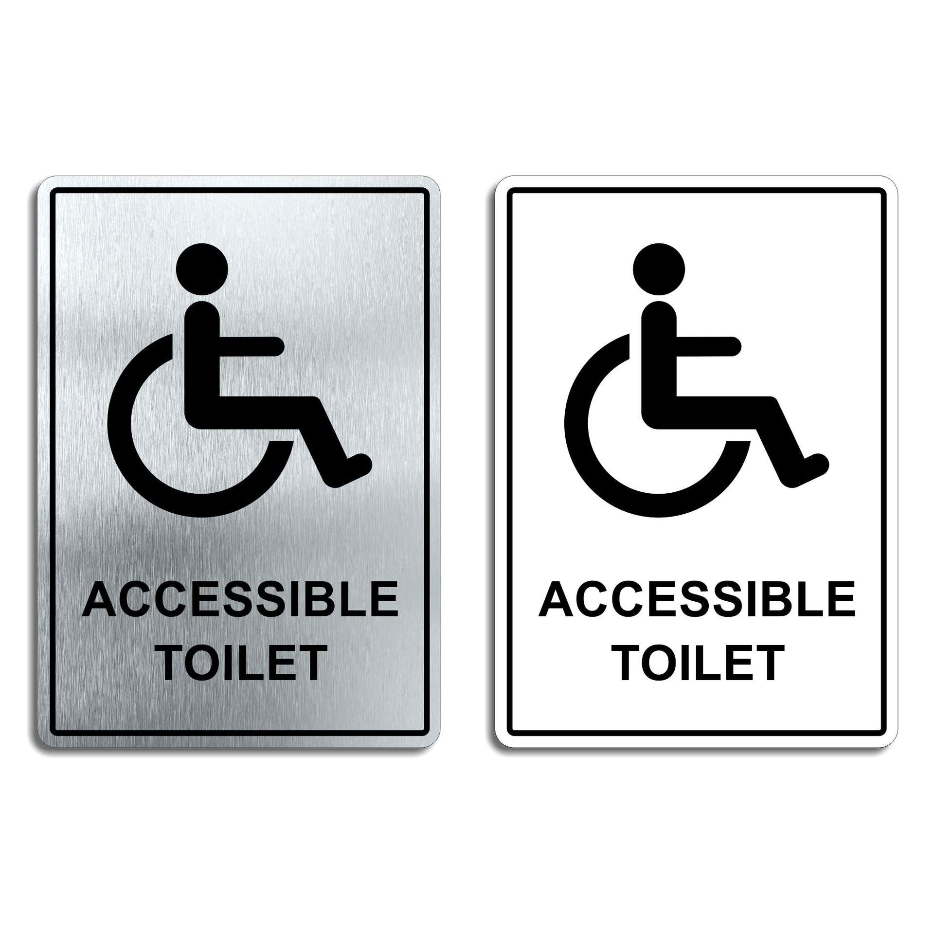 Enhance the look of your doors with our brushed aluminium Accessible Toilet Door Signs. Brushed silver aluminum door signs are known for their prestigious look that is both sleek as well as being practical in everyday use. The distinctive brushed aluminium texture creates a modern aesthetic that is perfect for businesses or organisations aiming to convey a sense of style and professionalism. The textured metallic finish adds a touch of luxury, making brushed aluminum door signs a popular choice for any location. Manufactured by us here in the UK using a high quality 3mm brushed silver aluminium composite sheet each door sign is suitable for either internal or external use. Our door signs are precision cut to size and shape using one of our flat bed CNC routers and is then digitally printed directly to the surface using the very latest UV printing technology. This door sign is also available in a 3mm bright white aluminium composite finish. These door signs are supplied with self adhesive pads to allow for easy installation. We also offer a range of stylish screw fixings that are designed to compliment the finish of each sign. Due to the large selection of different sign designs to avoid drill holes in the actual image or text area we do not supply these signs with any pre-drilled holes.