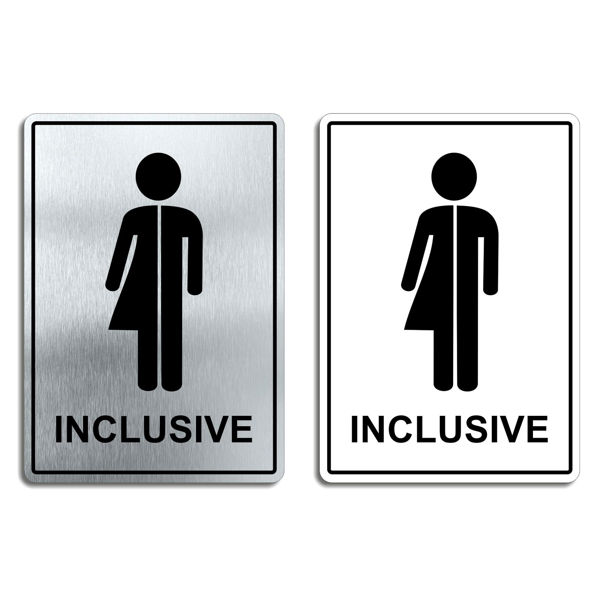 Enhance the look of your doors with our brushed aluminium Inclusive Toilet Door Signs. Brushed silver aluminum door signs are known for their prestigious look that is both sleek as well as being practical in everyday use. The distinctive brushed aluminium texture creates a modern aesthetic that is perfect for businesses or organisations aiming to convey a sense of style and professionalism. The textured metallic finish adds a touch of luxury, making brushed aluminum door signs a popular choice for any location. Manufactured by us here in the UK using a high quality 3mm brushed silver aluminium composite sheet each door sign is suitable for either internal or external use. Our door signs are precision cut to size and shape using one of our flat bed CNC routers and is then digitally printed directly to the surface using the very latest UV printing technology. This door sign is also available in a 3mm bright white aluminium composite finish. These door signs are supplied with self adhesive pads to allow for easy installation. We also offer a range of stylish screw fixings that are designed to compliment the finish of each sign. Due to the large selection of different sign designs to avoid drill holes in the actual image or text area we do not supply these signs with any pre-drilled holes.